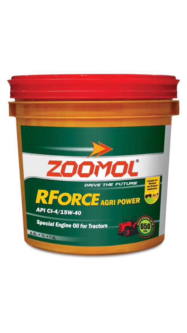 Zoomol RForce Agri Power 15W-40 meets the requirement of API CI-4 and is recommended for use in all the farm tractors manufactured by major OEMs where such type of oil is recommended.
